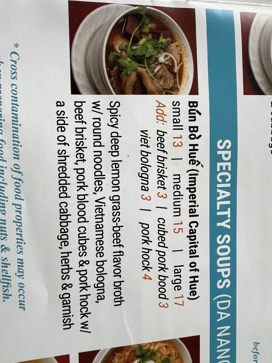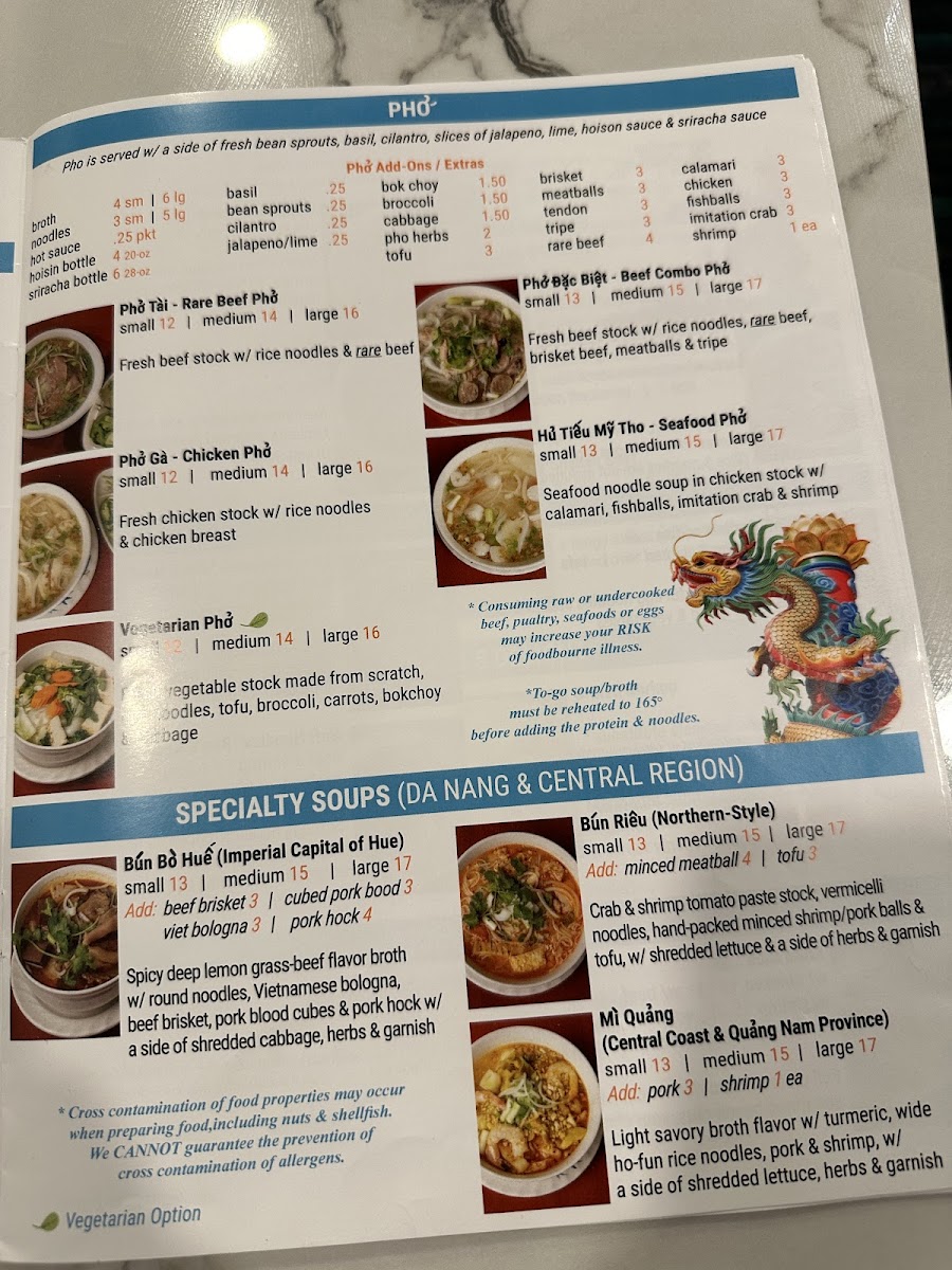 The menu at Da Nang Vietnamese Restaurant offers a range of traditional Vietnamese dishes and beverages organized into several categories to accommodate various tastes and meal preferences. Visitors will find a selection of pho and other soups featuring different types of meat and broth bases, including rare beef, chicken, and specialty noodle soups such as Bun Bo Hue and Bun Rieu Northern Style.