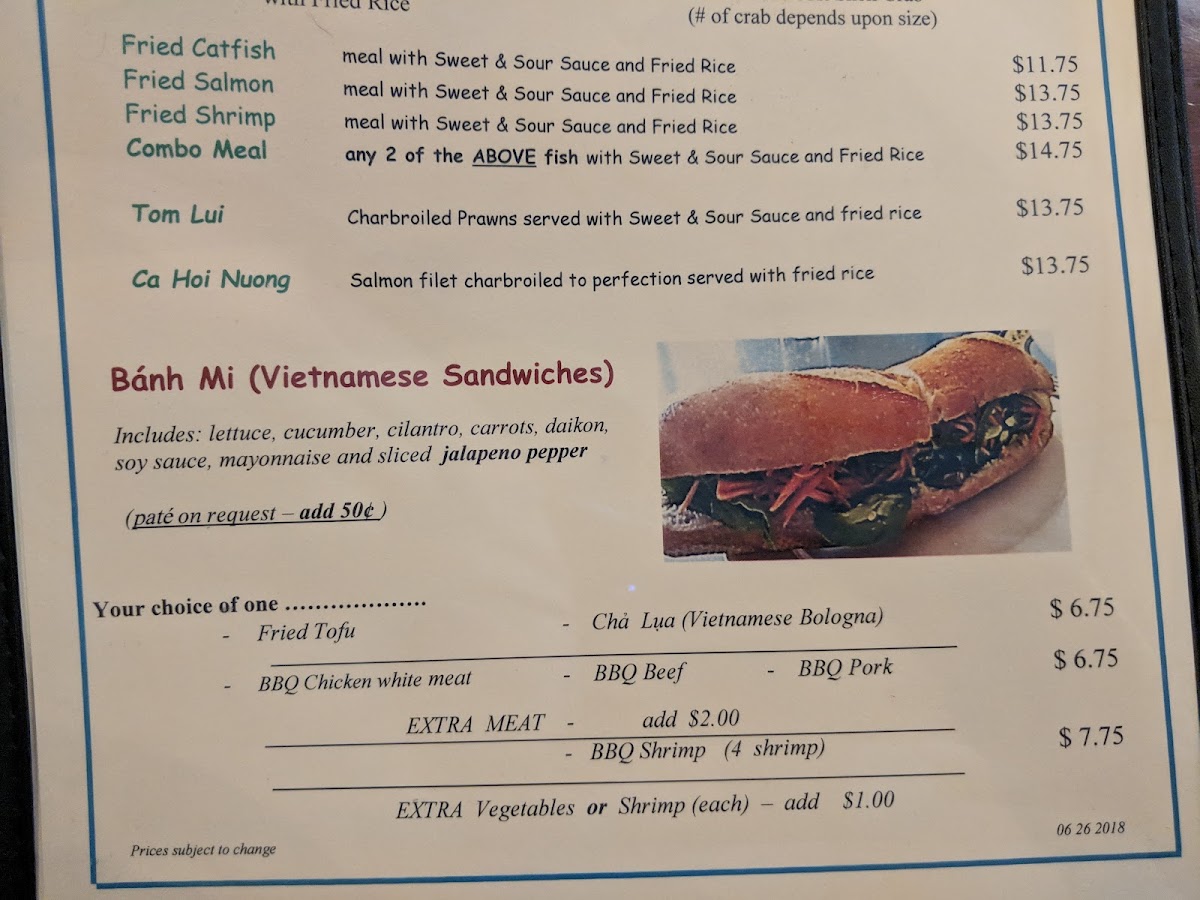 Vietnamese sandwiches, commonly known as Banh Mi, are also available, with options to add shrimp or other fillings. For those preferring deep-fried items, the Fisherman's Delight sections include one or two choices of deep-fried items served with vegetable fried rice and sweet chili sauce.